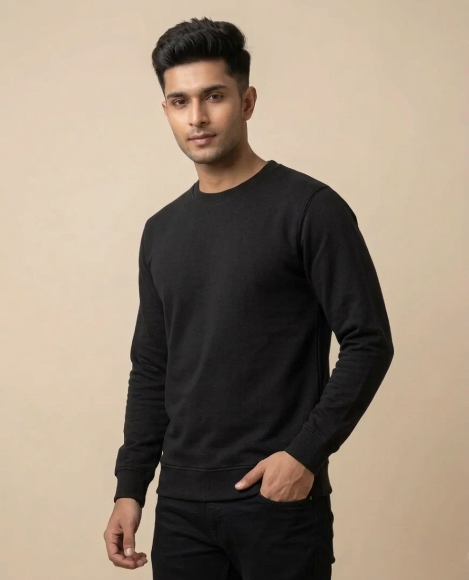 Designed for the modern Indian man, this sweatshirt features a tailored slim fit that sits perfectly on the shoulders and tapers toward the waist. The solid Jet Black color is deep and fade-resistant, ensuring it remains a staple in your wardrobe for seasons to come.