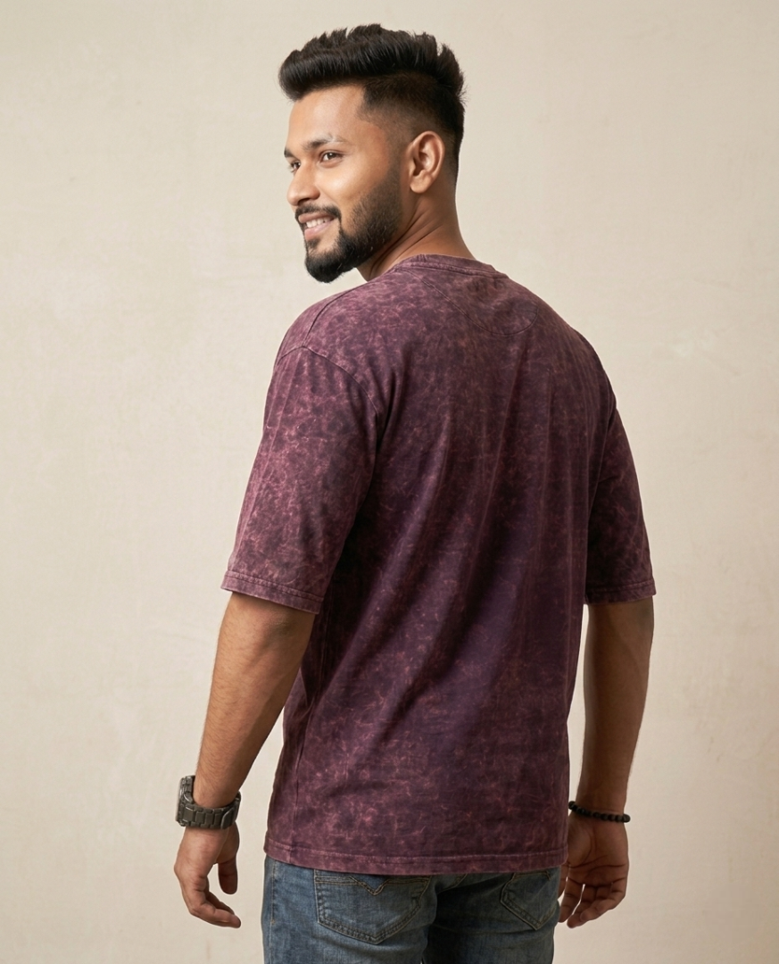 Men Grape Wine Oversized Textured Acid Wash and Solid Round Neck T-Shirt