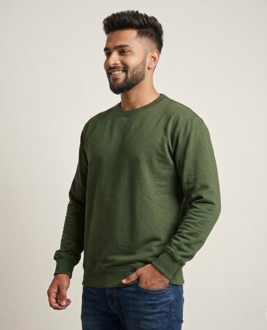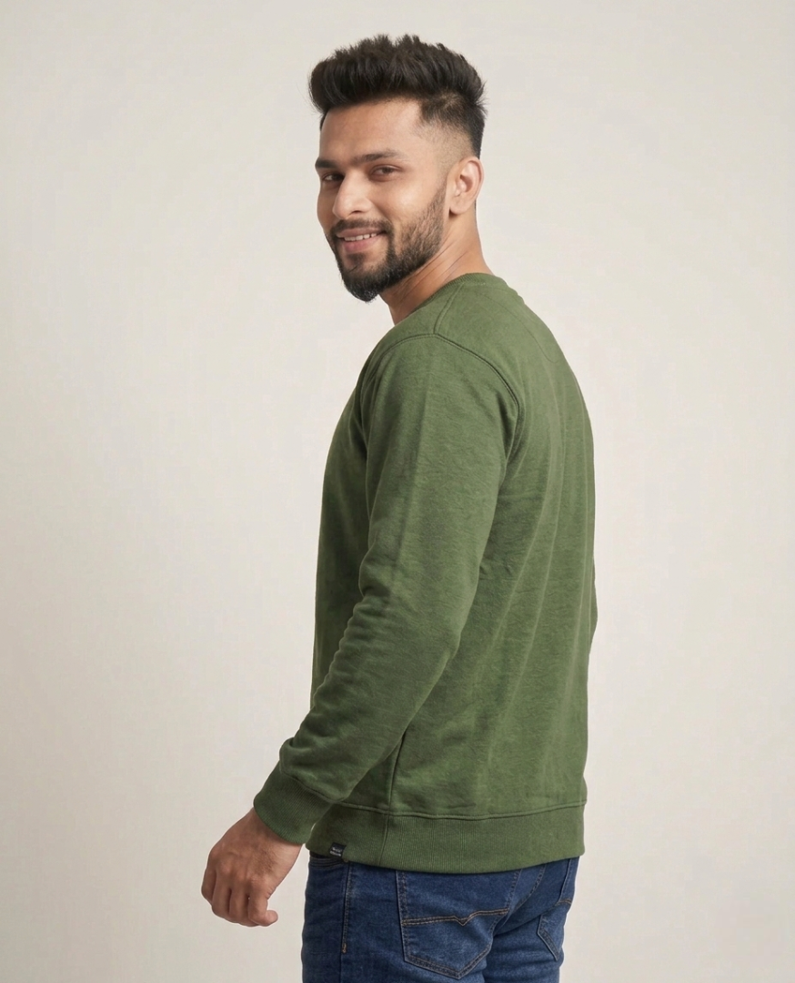 Men’s Solid Olive Green Crew Neck Sweatshirt | Premium Fleece Cotton Blend | Relaxed Fit Casual Pullover