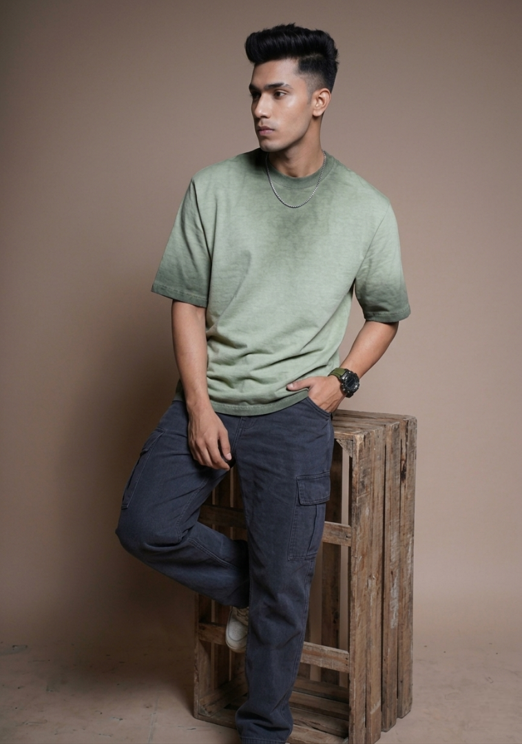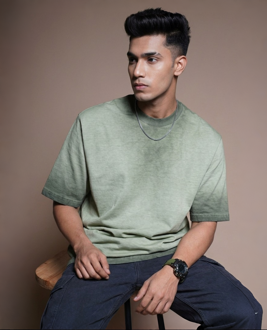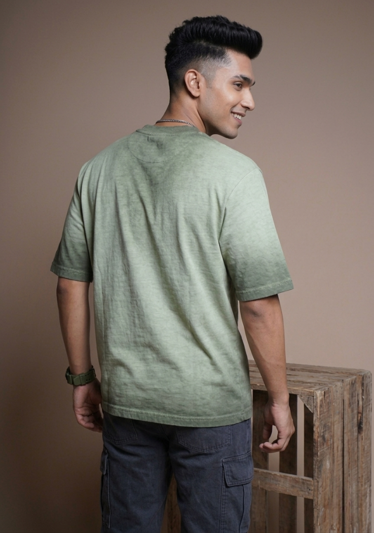 A premium, drop-shoulder t-shirt featuring a unique sun-faded sage green wash. Crafted from heavyweight cotton for a structured, boxy silhouette that embodies modern streetwear.