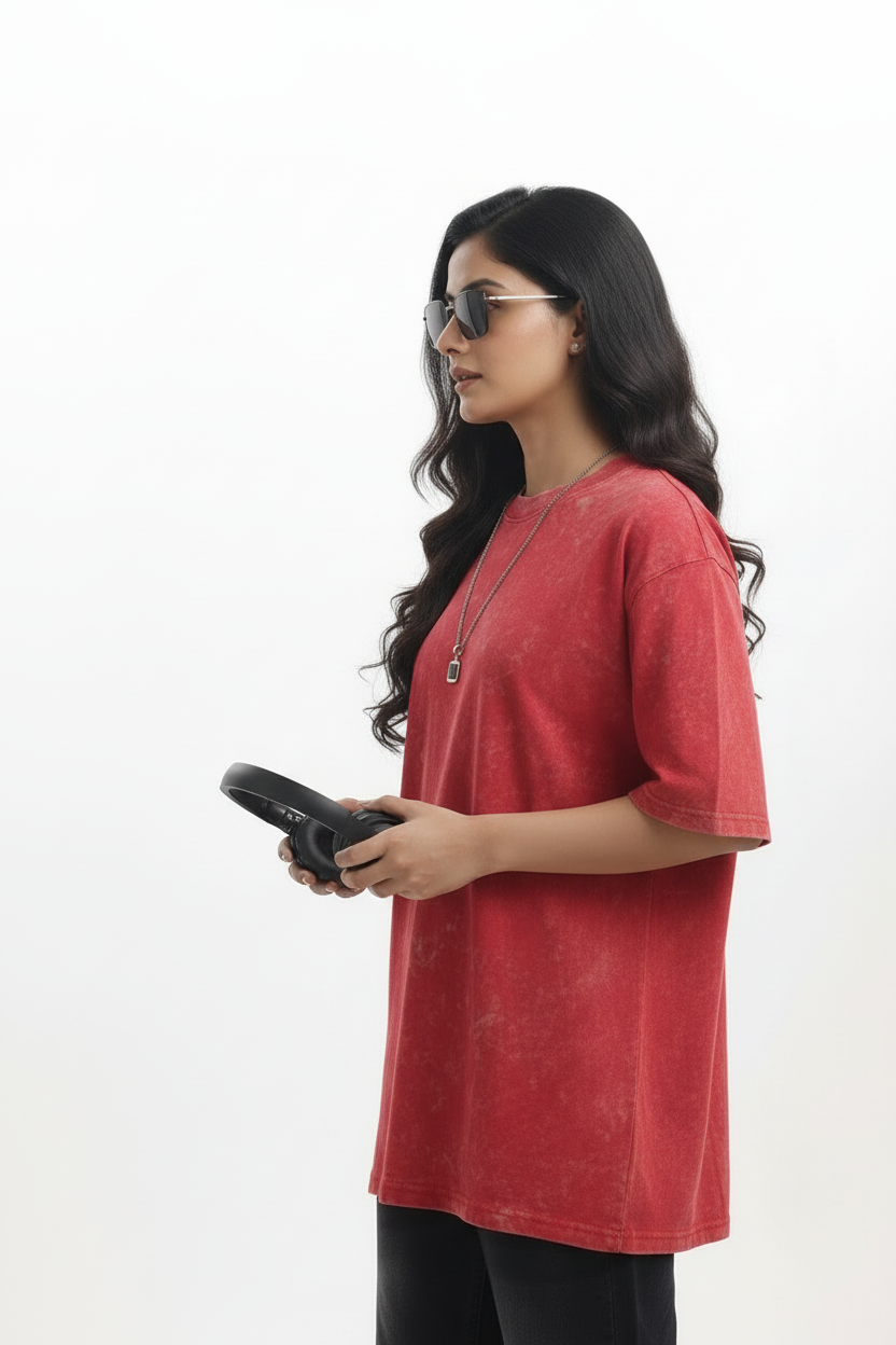 A bold, street-ready oversized t-shirt in a heavy acid-wash crimson red, featuring a vintage distressed texture and a relaxed, urban fit.